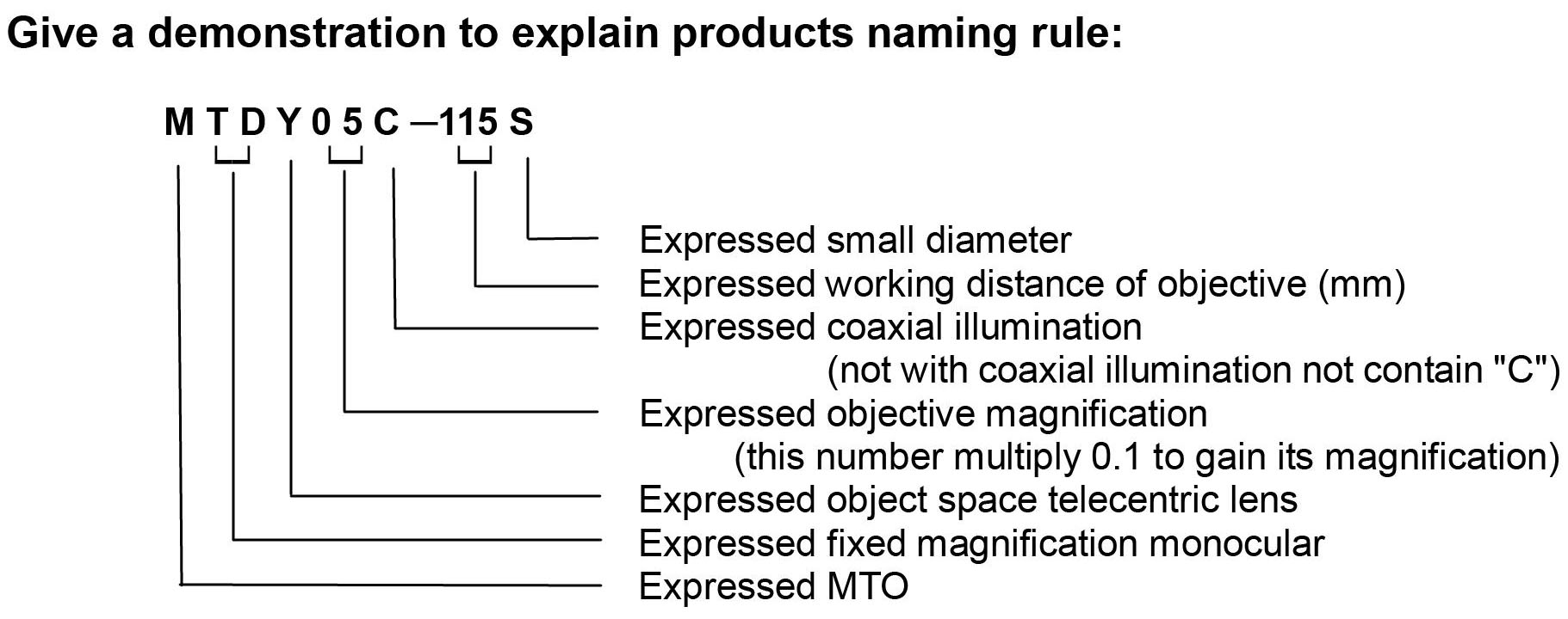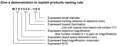 5. In the line of total magnification, “1/3"” is expressed CCD camera's specifications, “9"”、“14"” is expressed monitor's screen dimensions. “1/3"、9"” is expressed the total magnification of MTDY series Object Space Telecentric Lens in 1/3" CCD camera and 9" monitor.